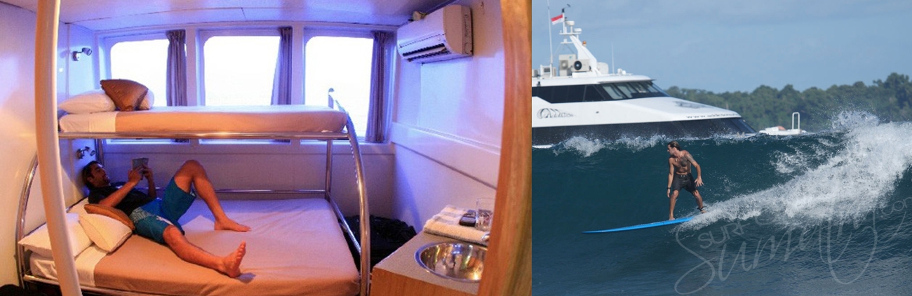 The MV Addiction is the most luxurious surf charter in the Mentawai Islands. At 24 metres (80 ft) in length and 8 metres wide the vessel is also one of the 2 largest boats operating in the region. There are 4 guest cabins, 3 of which have a double bed and single bunk and 1 that has 4 spacious bunks. It has a large gourmet galley, dinner seating for 10 guests and a huge lounge area. There are also two spacious outdoor lounges and dining areas.