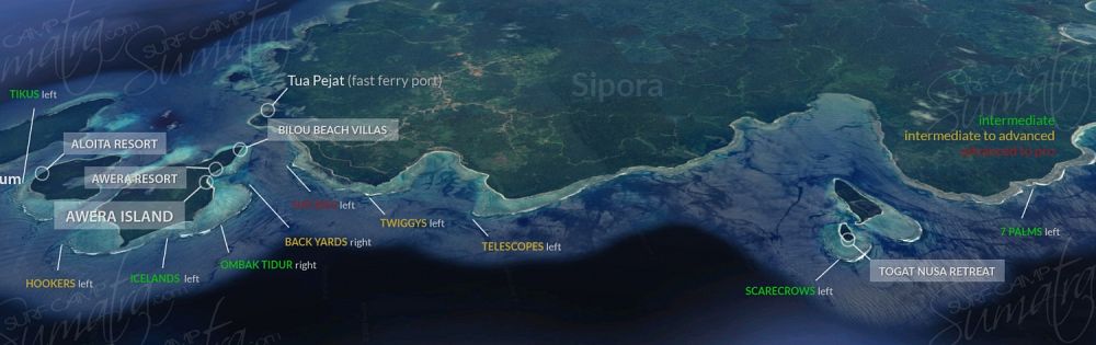 Detailed information for all the surf breaks can be found in the destination's section of the site within the North Sipora pages: Awera Island Surf Breaks